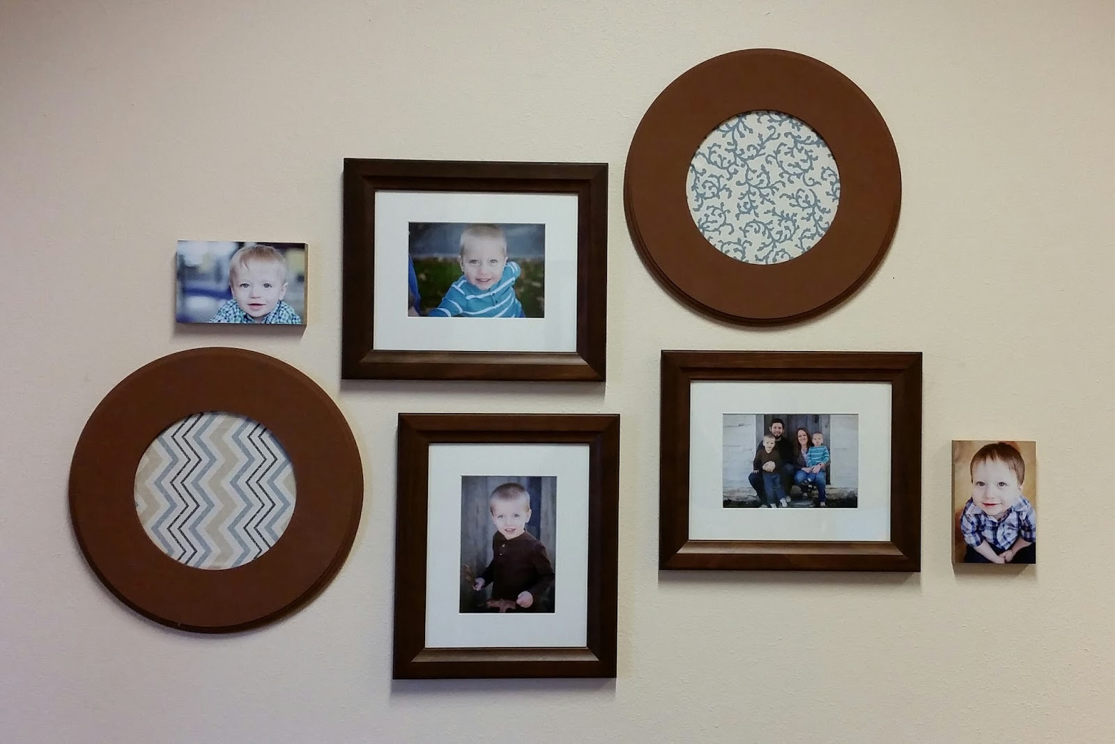 There are three components to the gallery wall: the large circle frames with fabric, the three framed photos and then two mounted photos.